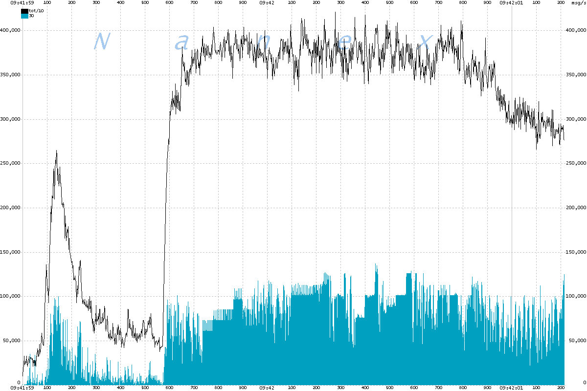 | Several individual OPRA data lines show gaps which we believe are exhaustion events. These quiet periods of no quotes are common, can last 20 milliseconds, and almost always follow a spike in activity. We have verified that there were no drops in the data and that the charts accurately show the quote traffic rates. Several lines, noteably #37, show a period of fluttering between a high rate and zero which seem to appear during times of severe saturation. |