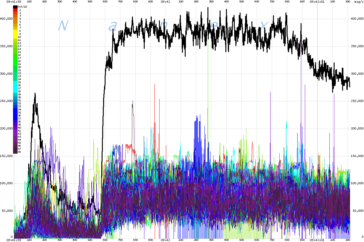 The electronic S&P 500 futures experienced a withdrawal of liquidity beginning about a minute before the release of the PMI number. At approximately 9:41:59.550, 1275 contracts cleared through 4 levels of the offer side of the order book. This coincided with the explosion in OPRA quote traffic. The first image shows quote message rates for each of the 12 CQS data lines that carry data for NYSE, AMEX, and ARCA equities and ETFs in 2ms intervals. Notice how quickly activity drops after the peak compared to the OPRA images below it. Normally, options activity follows equity activity very closely. |