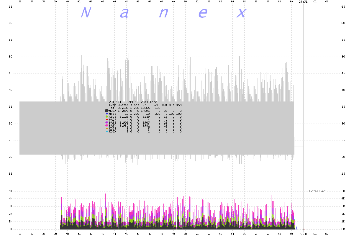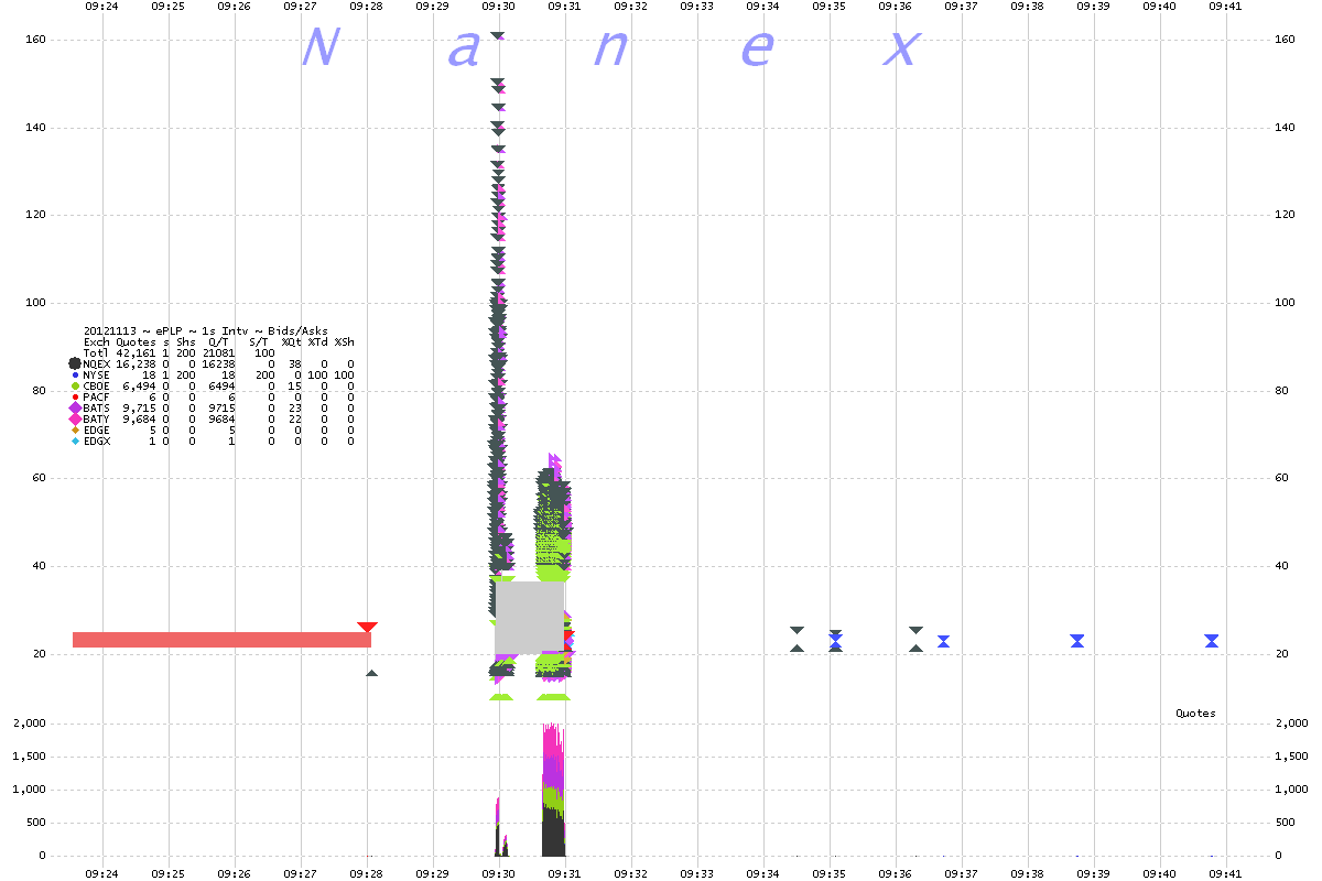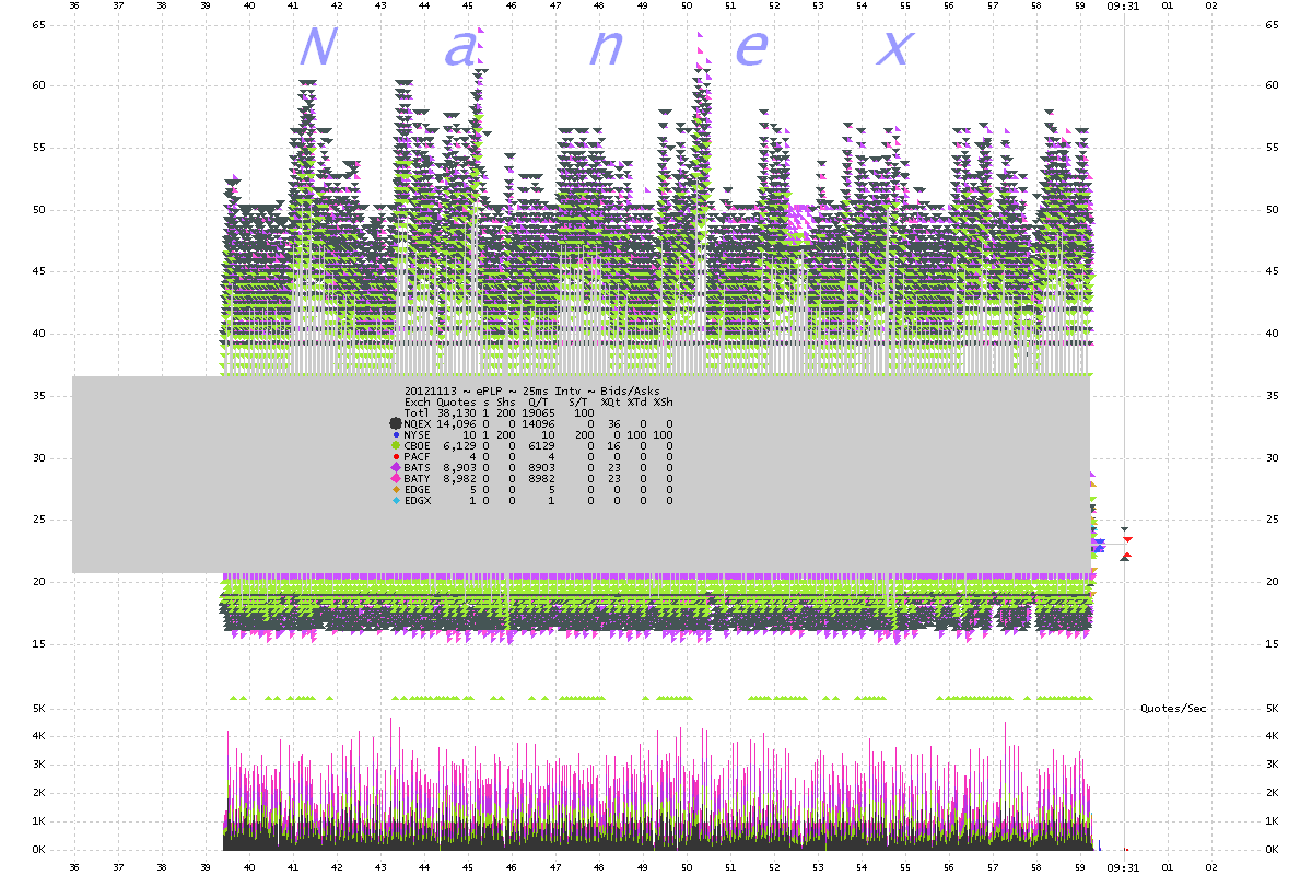 3. PLP ~ 25 millisecond interval chart showing NBBO. Top of shading is Best Offer (ask), bottom of shading is Best Bid..
