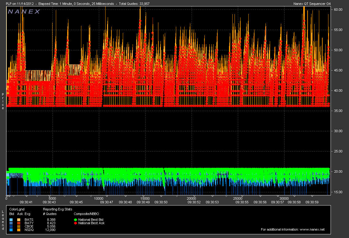 Here is a real world example. The stock of Protective Life Corp (symbol PLP) is traded maybe a few hundred times over an entire day. Yet, on November 13, 2012, in one 10 second period, over 21,000 quote messages were blasted across exchange networks (a quote message is basically an order that was sent, but not traded). From the charts, it appears that quotes from 4 exchanges were tracking each other.