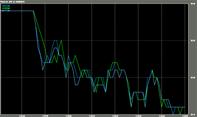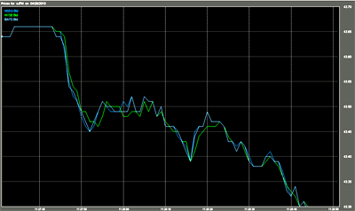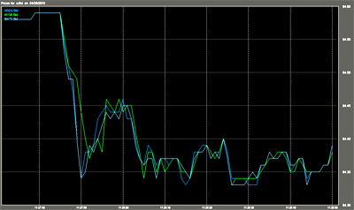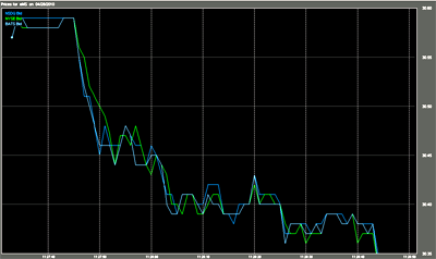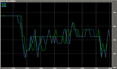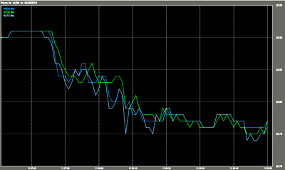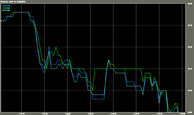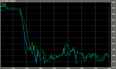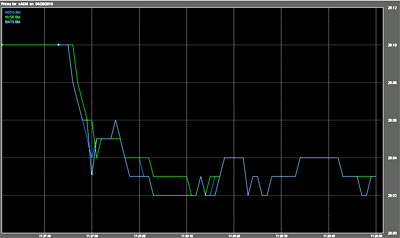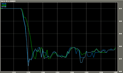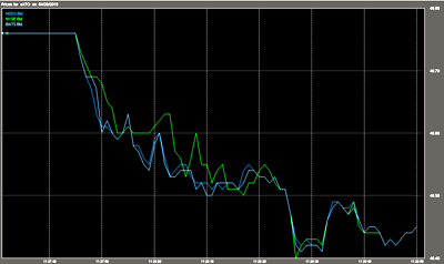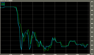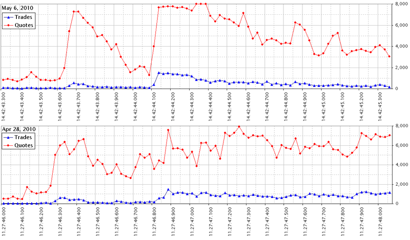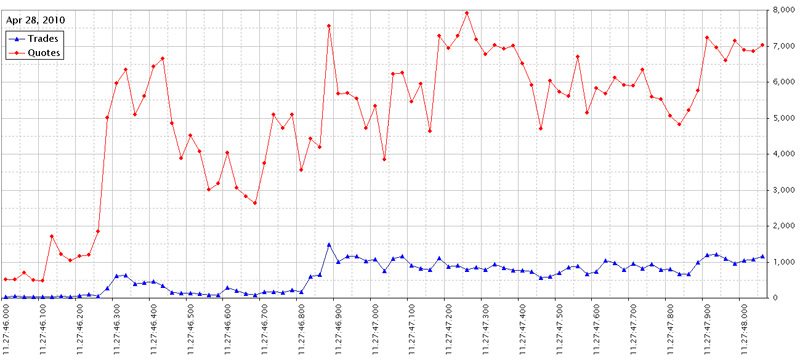 While scanning historical data searching for previous days which exhibit similar behavior to that of 05/06/2010, we found a time on 04/28/2010 with quote bursts very similar to those we saw on 05/06/2010 (just prior to the NYSE feed delay). The time of this quote burst began at 11:27:46.100 on 04/28/2010.