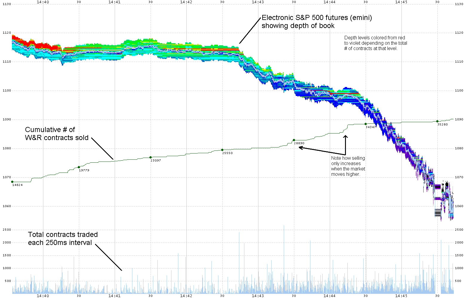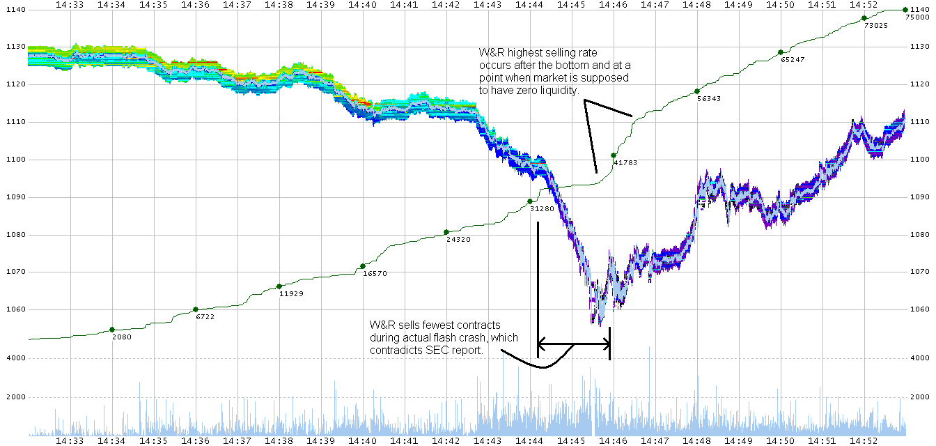 Update: April 11, 2012We received answers to the questions below: read the email exchange.Watch a video of the emini depth of book and an equity hot list as it looked during the flash crash. Update: April 10, 2012We recently reread the paper from Andrei Kirilenko and Albert (Pete) Kyle titled: The Flash Crash: The Impact of High Frequency Trading on an Electronic Market. As you may know, Kirilenko was a primary author of SEC final report on the flash crash, and often the same language appears in both papers. Based on interviews and our own independent matching of the 6,438 W&R executions to the 147,577 CME executions during that time, we know for certain that the algorithm used by W&R never took nor required liquidity. It always posted sell orders above the market and waited for a buyer; it never crossed the bid/ask spread. That means that none of the 6,438 trades were executed by hitting a bid. Therefore, the following statements from page 36 of Kirilenko’s paper cast serious doubt on the credibility of their analysis: (Similar language can be found in the SEC final report starting at the bottom of page 14.)
