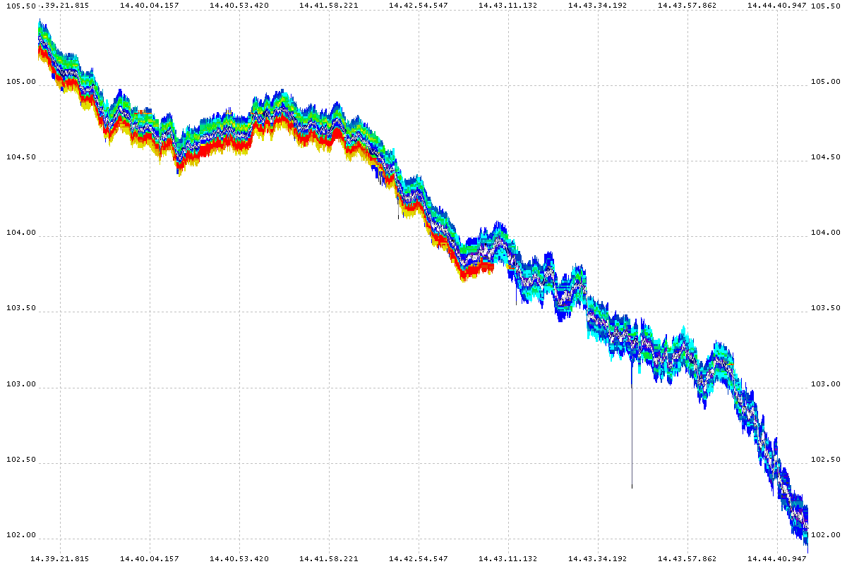 Below are 500 ms and 1 second interval charts of order book depth (up to 10 bid and 10 ask price levels) of 20 different stocks during the flash crash. The chart is color coded by resting order size in the book. Red means a lot of size, violet indicates very little size, and black indicates almost no size at all. On some charts (QQQQ at 14:36:10), note the sudden change in depth — probably indicating a major player withdrawing from that stock.