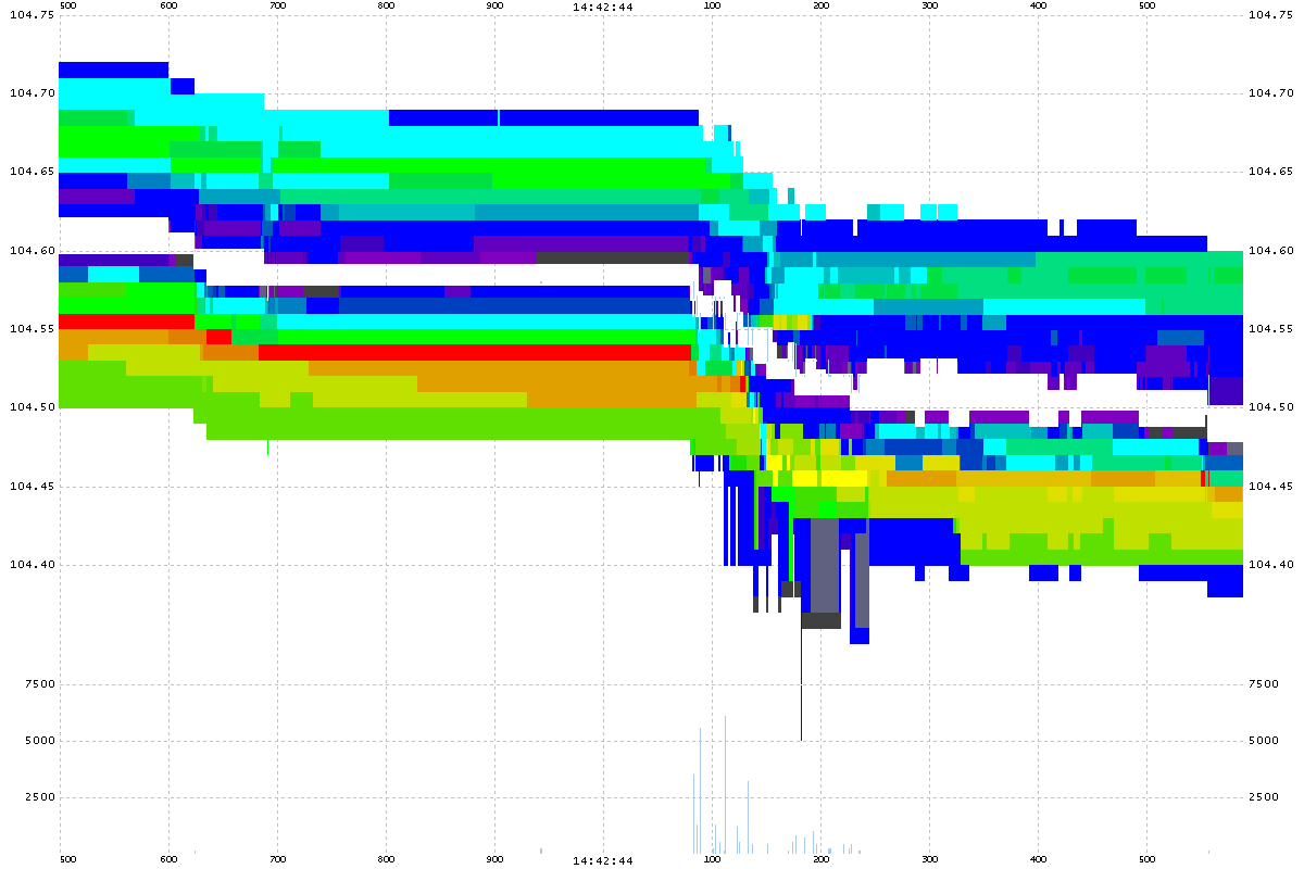 Below are 1 millisecond interval charts of order book depth at the time of the ignition event (14:42:44.100). If you look closely, you can see bid order size withdrawl right before and around the event.