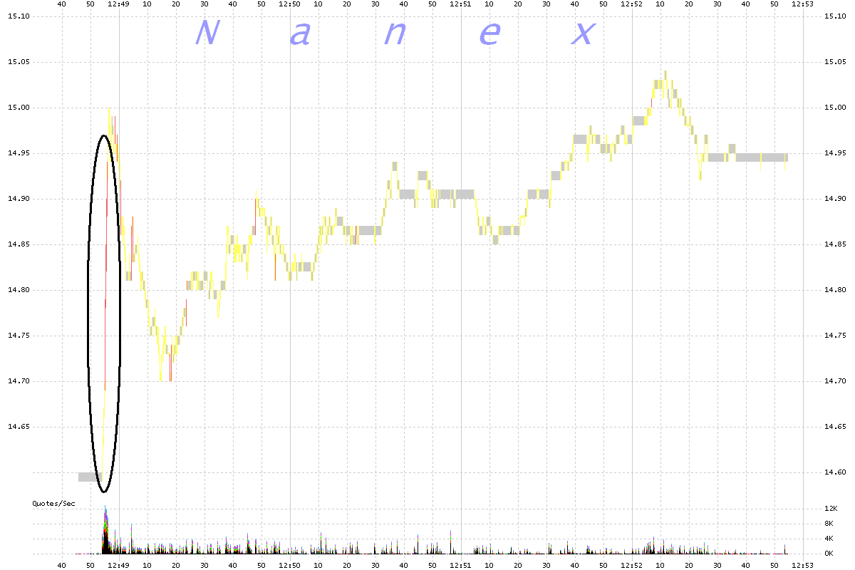 Millions of traders depend on the accuracy of exchange timestamps — especially after bad timestamps were found to be a key factor in the disastrous market crash known as the flash crash of May 2010. We are confident the exchange timestamp problem has been completely addressed by now: the SEC would have made sure of it. Adding accurate timestamps is not exactly rocket science; it’s not even considered to be a difficult problem. Based on recent marketing materials, the exchanges are practically experts on measuring time. And with hundreds of millions in annual data feed subscriptions paid by the same subscribers expecting quotes with accurate timestamps, there is no shortage of funds to make it happen. So we can be certain the exchange timestamps were accurate, which means that HFT has truly entered the era of the fantasecond. *** But let us suppose for a moment that the timestamps were not accurate, and in reality quotes were queued, and therefore delayed, and not timestamped until leaving the queue. So we checked for the usual capacity problems which have led to one of the types of feed delays that we have exposed before and couldn’t find any. For example, detailed analysis of the UQDF data feed that transmits this information to traders shows that the traffic rate for all output lines and specifically multicast line #6 which carries YHOO, were well below peak rates. This raises a few thorny questions. Does this mean there are far more delays than previously thought? Is there a delay every time we see an explosion of quotes in one stock? Because recently, that, sort, of thing, happens, all the time. Regulation NMS (Reg. NMS) makes it clear that direct exchange feeds are prohibited from having a speed advantage over the UQDF data feed. The reason is primarily because UQDF computes the NBBO, which is the key component of Reg. NMS that assures investors they are getting the best price when buying or selling stocks. This assurance is called trade-though price protection. How does one ensure trade-through price protection if the price being protected hasn’t even occurred yet? Maybe it would be better to just fantasize about fantaseconds after all. |