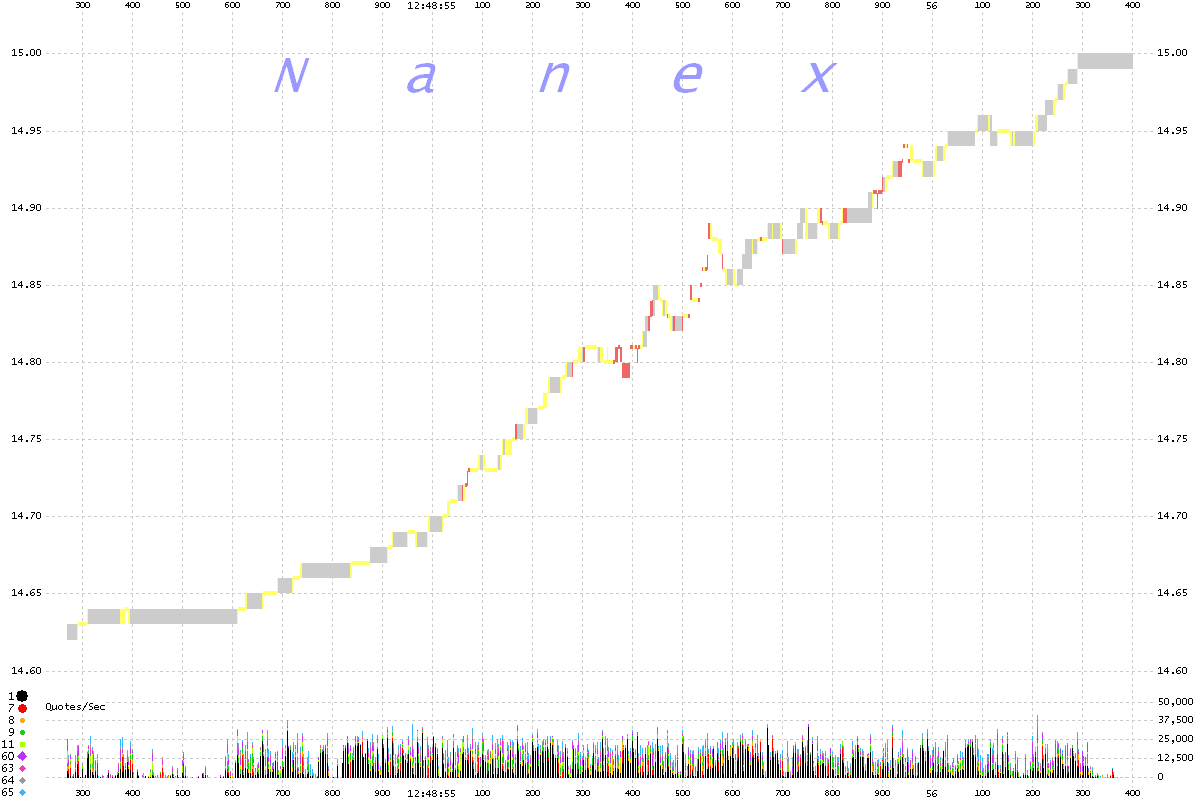 | The first chart is a 250 ms interval chart of the NBBO in YHOO which is plotted as vertical lines and colored red if the NBBO was crossed during the interval, yellow if it was locked, and gray if it was normal. The implied quote rate is shown as a histogram at the bottom and scaled in quotes/second. We will focus on the time shown in the black circle. |