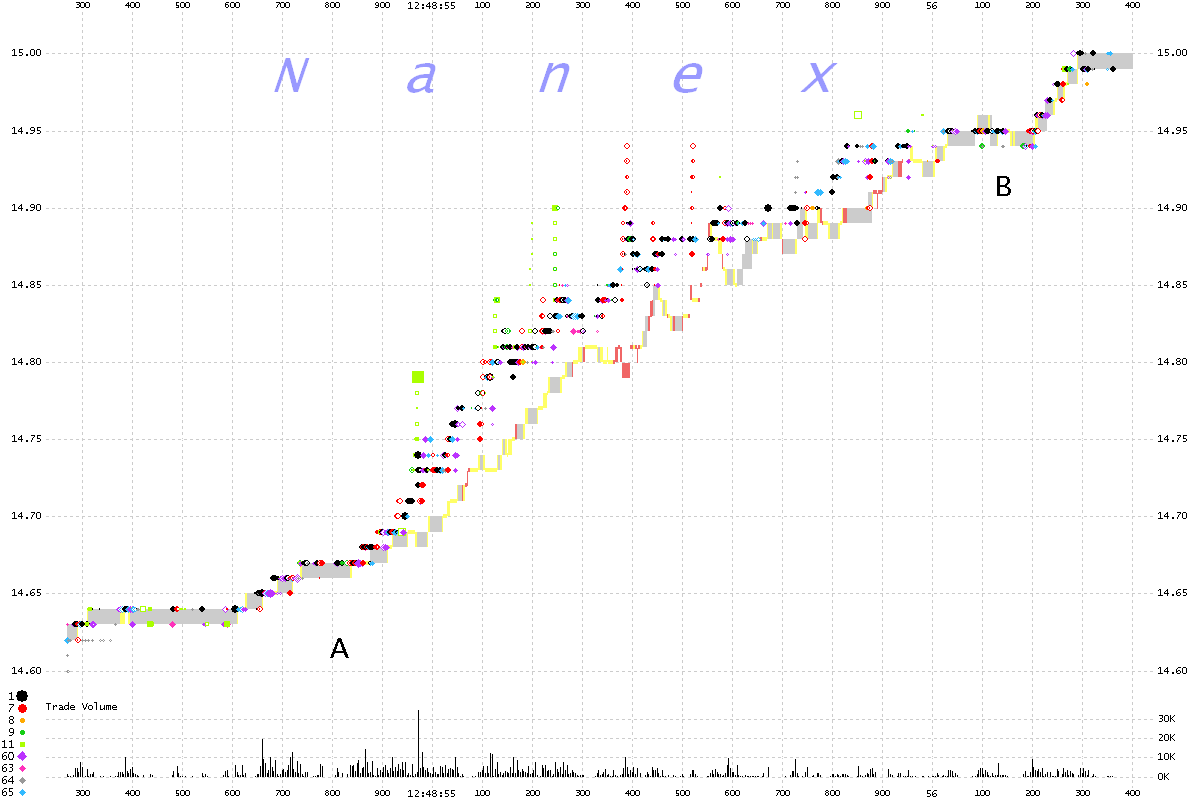 | The next chart includes trade executions which are plotted as dots or squares and sized according to trade size. A unique color and shape is assigned to each reporting exchange. What is unusual about this chart is that trades are reported ahead of quotes. The trades (dots and squares) should trail after the quotes (vertical bars). Up to the point in time that is labeled A, and after the point labeled B, trades and quotes were in sync. Between these two points, quote timestamps began falling behind. |