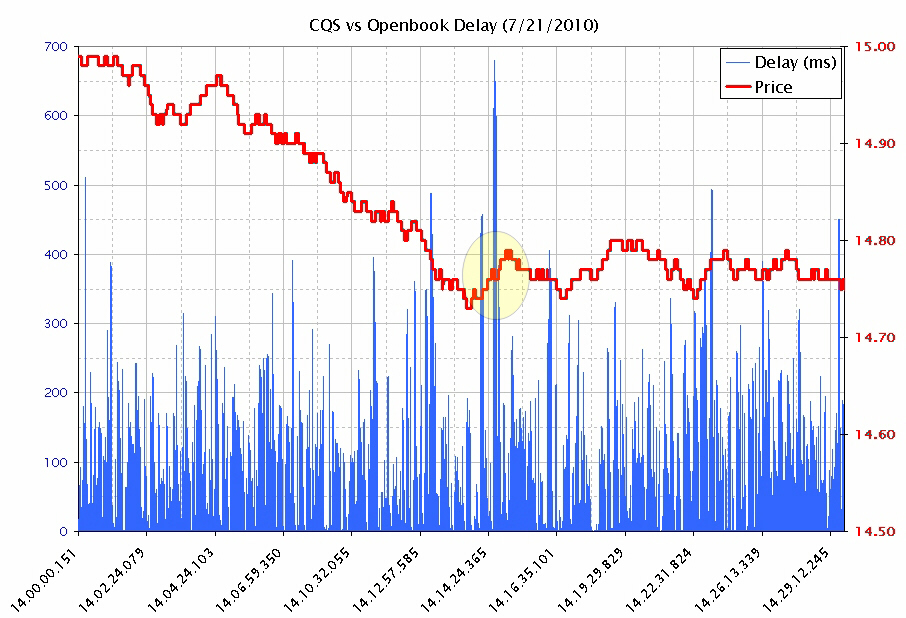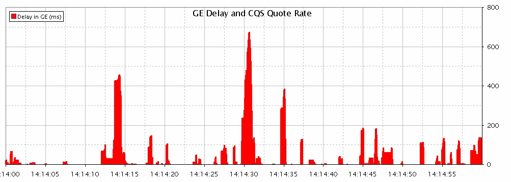 We wanted to see the extent of the delay between NYSE quotes from CQS and OpenBook on a more recent trading day. So we synchronized quotes from CQS and OpenBook for GE between 1pm and 4pm Eastern time and plotted 30 minutes worth of timestamp differences along with the quote price which are shown in Chart 1 below. We were surprised to see the frequency and magnitude of the delay. We thought high quote activity in a stock would cause a delay in that stock’s quote, but could not find any correlation between the quote activity in GE and the delay. Then we decided to focus on the one minute that had the highest delay, which is highlighted with a yellow circle in Chart 1. This one minute sample of the delay is plotted in Chart 2. |