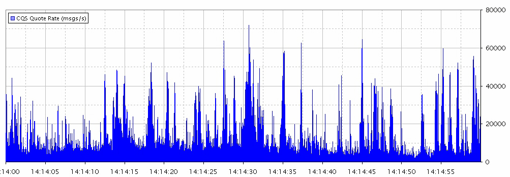 | Instead of looking at the quote rate for just GE, we decided to plot the quote rate for all stocks that NYSE sends to CQS. In other words, we plotted the sum total number of quotes where the listed exchange and reporting exchange are NYSE. This is plotted in Chart 3, which has the same time interval as Chart 2.