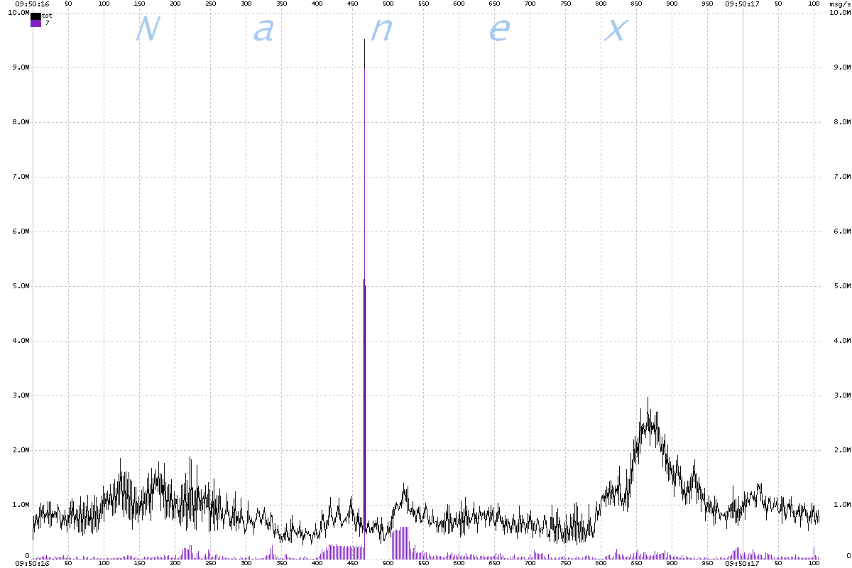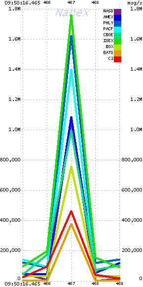 | On August 10, 2011, at 9:50:16.467, someone sent 8,557 quotes for 522 option contracts on the stock BIDU (Baidu) in 1 millisecond. This is equivalent to 8.5 million quotes per second, about twice OPRA’s current capacity. The quotes were sent from each of the 9 option exchanges that trade BIDU options. The net result was the overload of OPRA multicast line #7 which affected all option contracts that are quoted on that line (Symbols BH – BTZ). The line first became saturated (full) for 50 ms, then went completely dead for 60 ms, and finally took another 40 ms to recover.