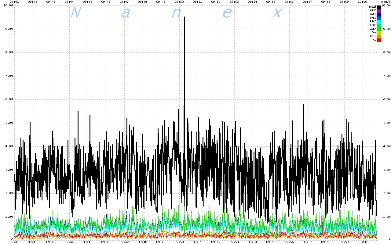 Chart 2. Peak 1 ms quotes per second for each contributing options exchange, plus the total.