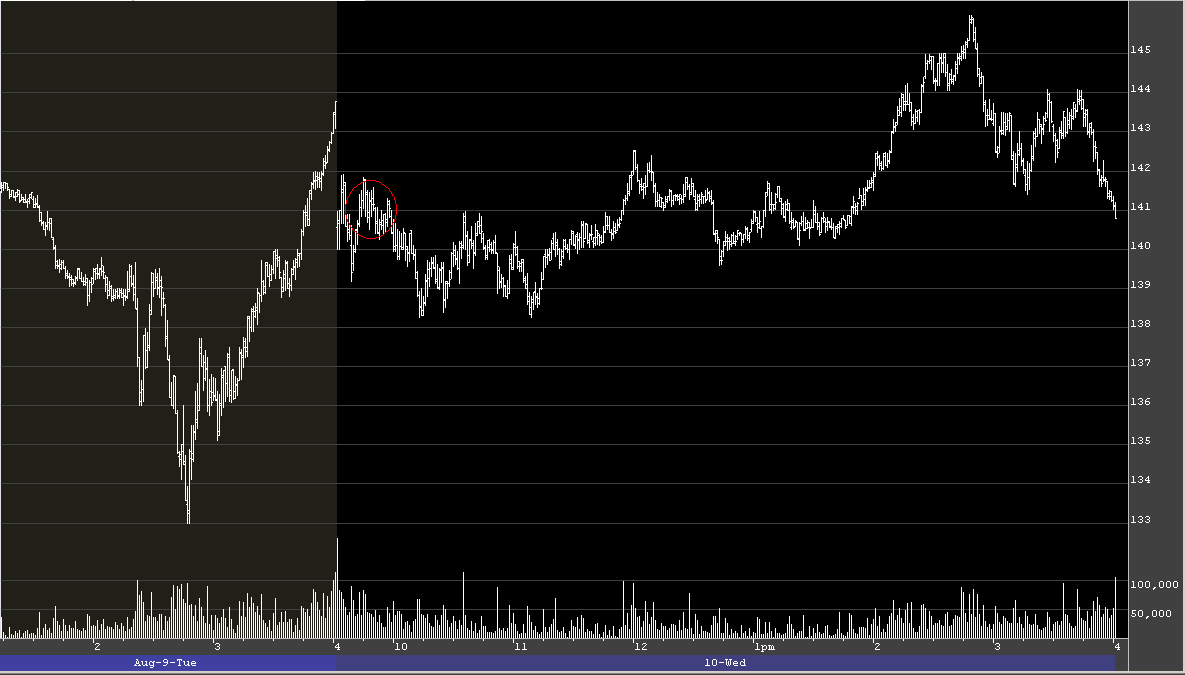 Chart 1. One minute OHLC chart of BIDU. The time of the event is circled in red.
