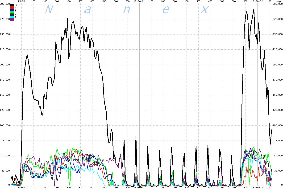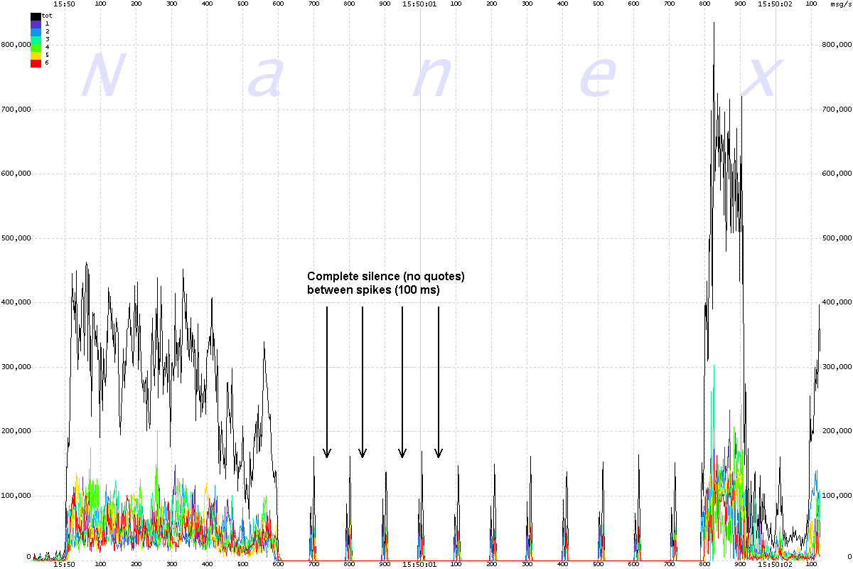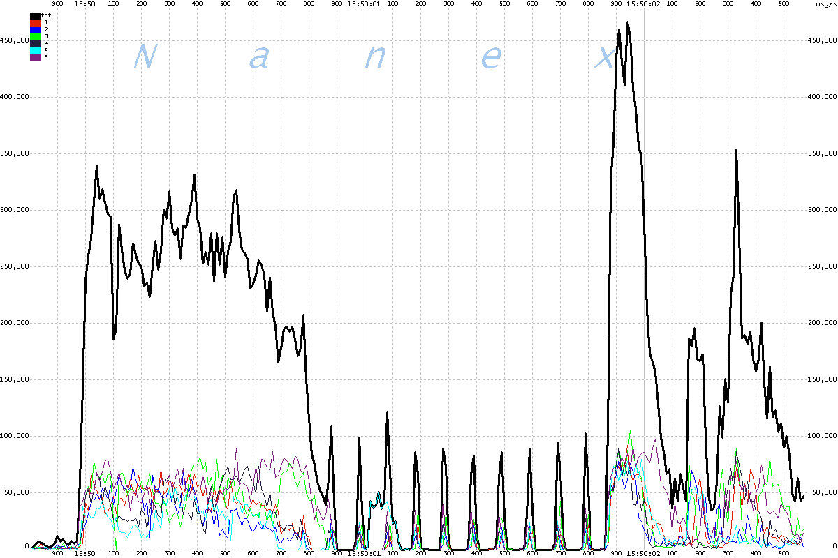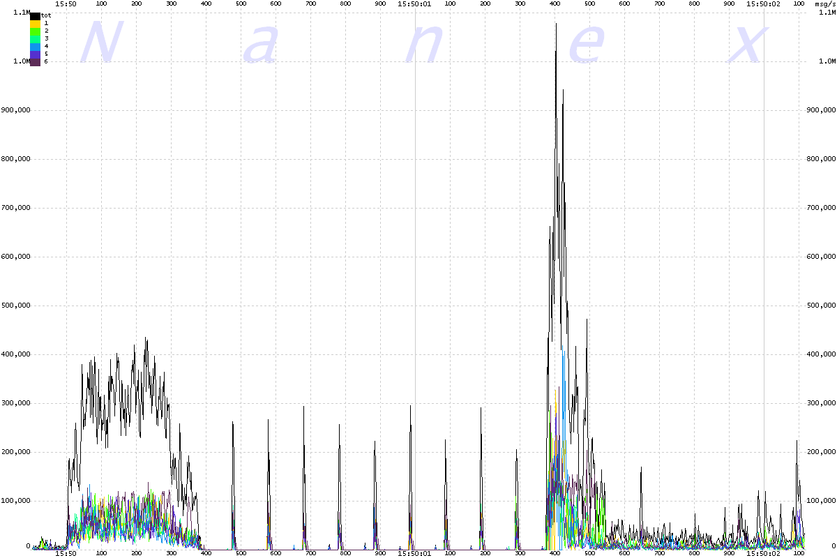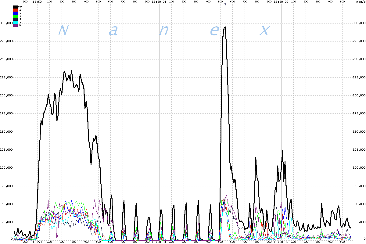| The chart below shows message rates for each of the 6 UQDF multicast lines that distribute Nasdaq equity quotes, plus the total of all 6 lines. The interval is 2 milliseconds, scaled to a per second rate. Note the odd 100 millisecond oscillations which begin at 15:50:00.600 and end at 15:50:01.800, followed by a heavy surge. |