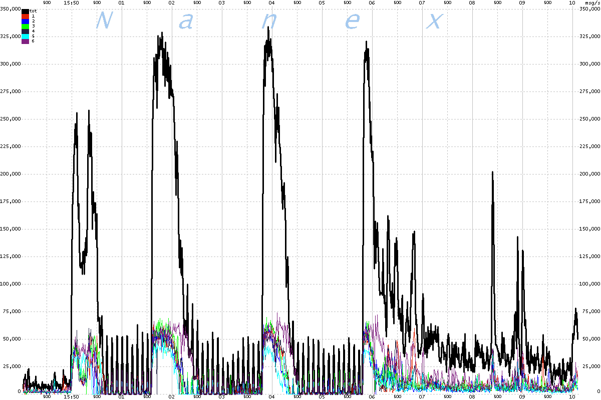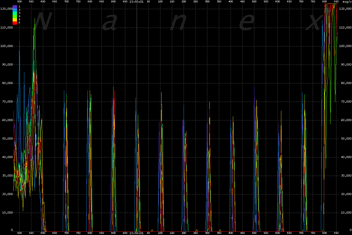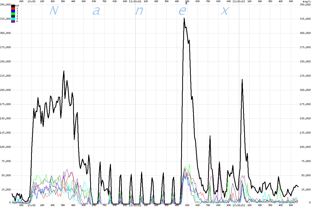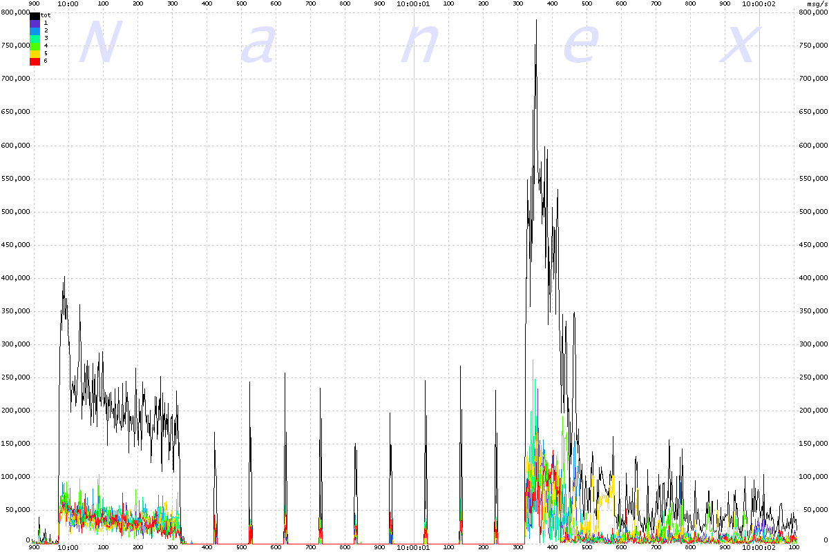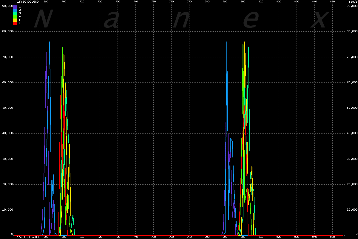 | The chart below shows message rates for each of the 6 UQDF multicast lines that distribute Nasdaq equity quotes, plus the total of all 6 lines. The interval is 2 milliseconds, scaled to a per second rate. Note the odd 100 millisecond oscillations which begin at 15:50:00.600 and end at 15:50:01.800, followed by a heavy surge. |