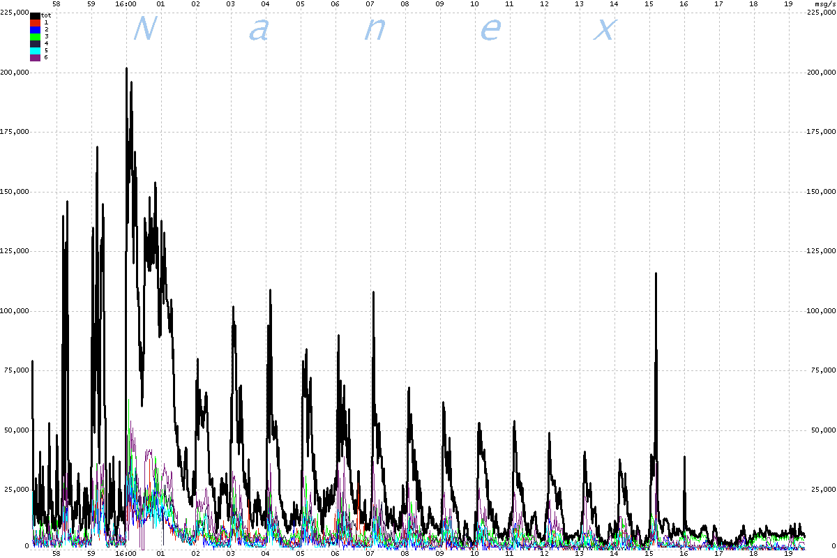 We think the 15:50:00 event is related to the release of closing order imbalance messages for Nasdaq stocks. The event typically lasts one or two seconds, though we have seen it last as long as 6 seconds. This event also occurs less frequently at 16:00:00, and at other times during very active trading. When UQDF is overloaded, it appears to enter an “emergency mode” where each multicast line consistently bursts a small number of quotes for 5 milliseconds, followed by complete silence for about 95 milliseconds. The bursts are consistent and very close to 100 milliseconds apart. The final burst contains significantly more quotes, and will often set the peak quote message rate for UQDF for the entire trading day. |