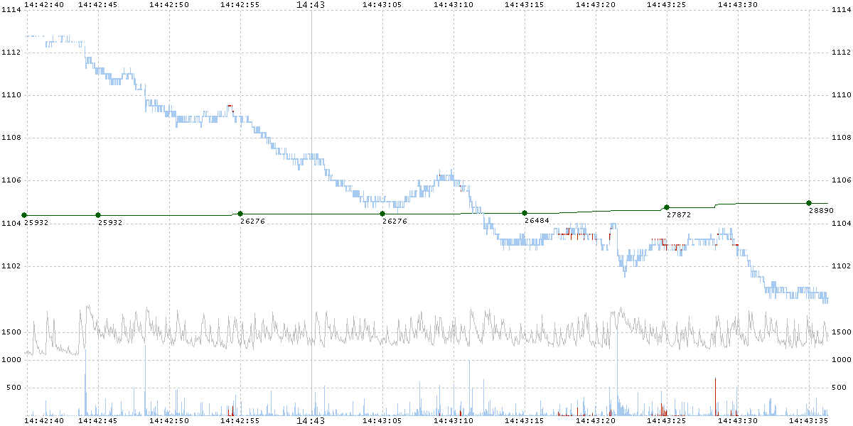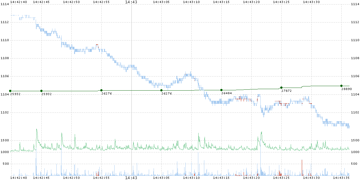 The chart above shows the high and low prices of the eMini for each 100ms interval (light blue). The green line with green dots and numbers shows the total number of Waddell & Reed contracts sold up to that point. Red price bars indicate the range of prices of W&R trade executions during that period. The light blue bars in the bottom section indicate the volume of eMini contracts traded in that interval. The scale for the volume is below the scale of the prices. Finally, the light green line in the chart above, shows the total number of equity trades in all equities during that 100ms interval — there is no scale for this line — it is shown to illustrate the correlation with the eMini contract volume traded during the same interval.